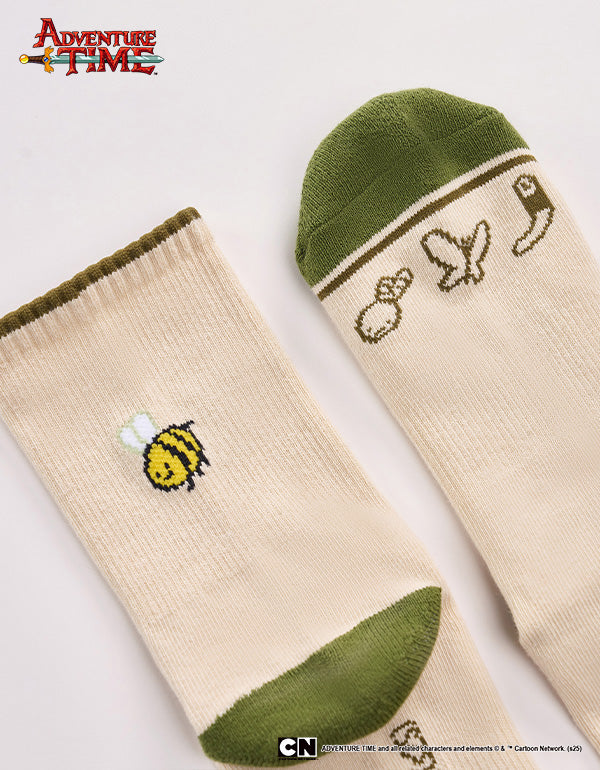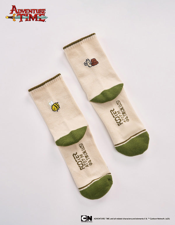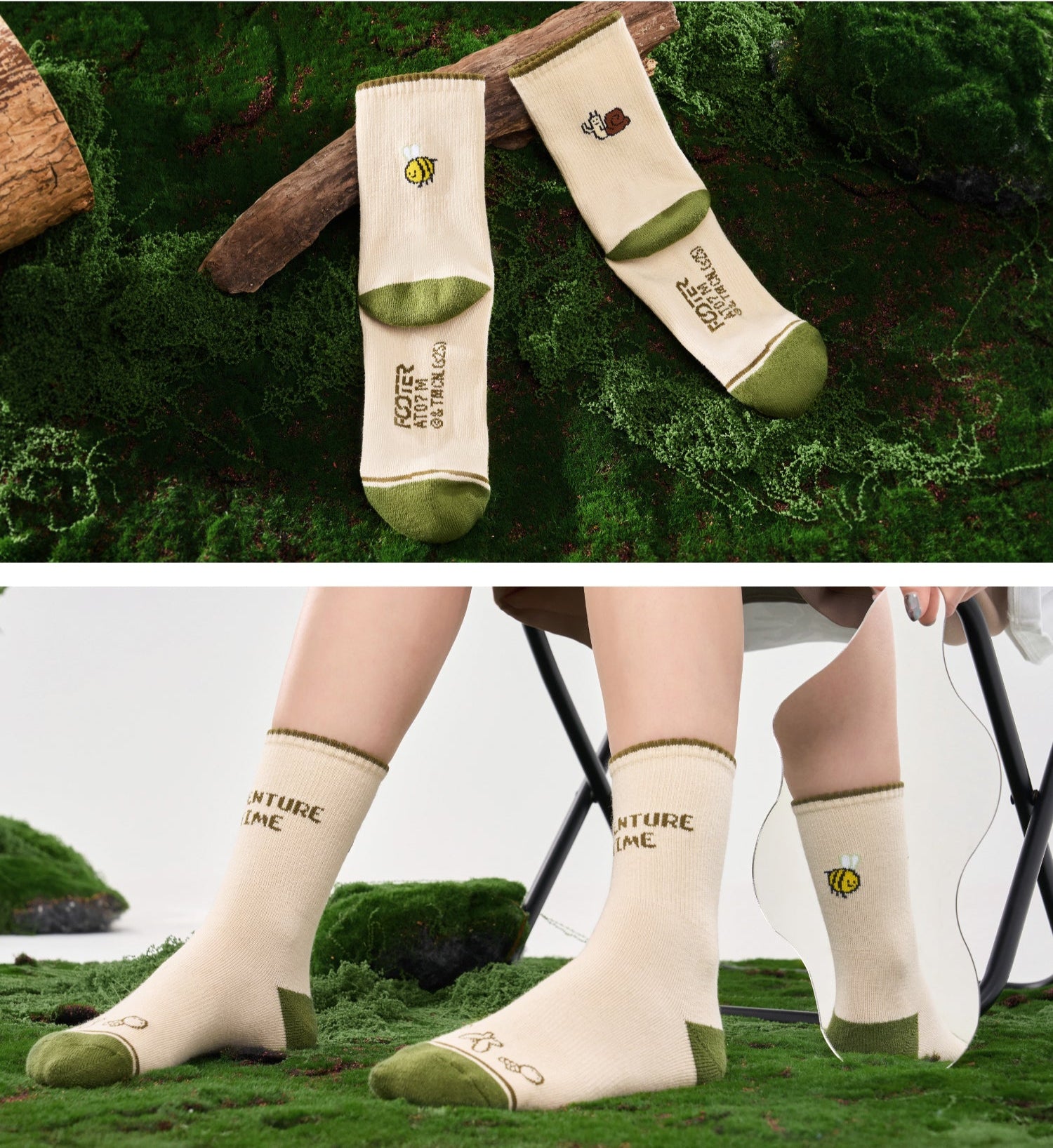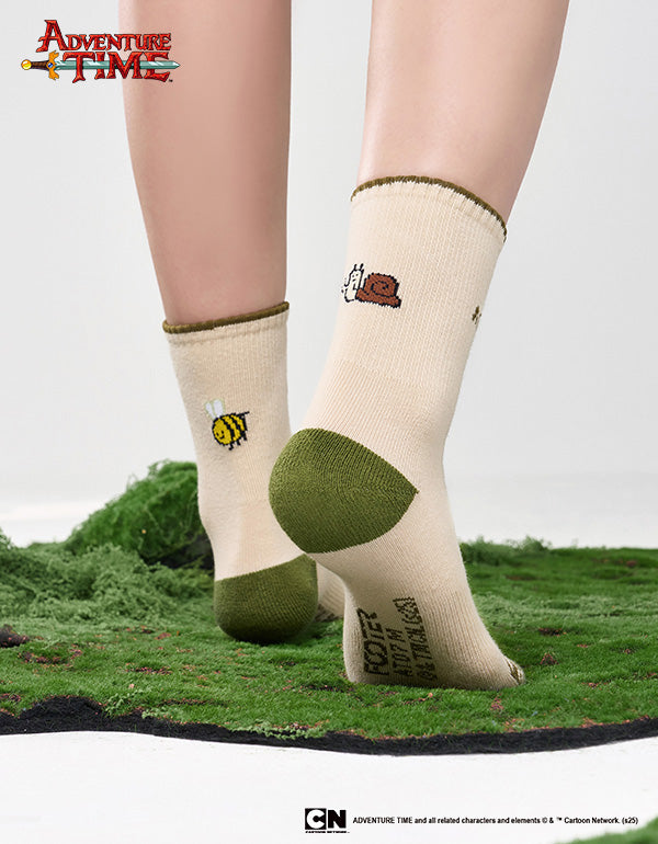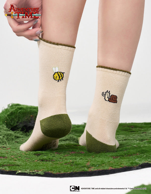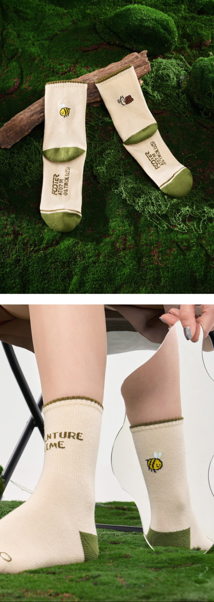 Set against a soft cream-green base, one sock features the snail, the other a bee, with even more adorable creatures playfully tucked near the toes. It’s a stroll through a carefree forest scene—perfect for those who love a laid-back, nature-inspired vibe.